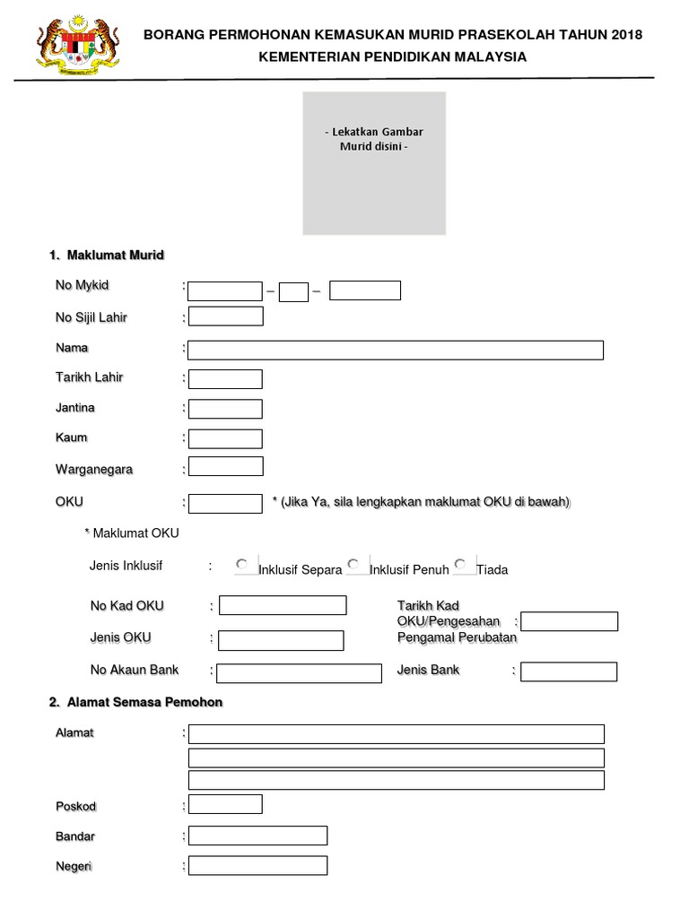 Borang Permohonan Kemasukan Murid Prasekolah