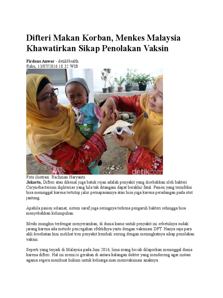Difteri Makan Korban Menkes Malaysia Khawatirkan Sikap Penolakan Vaksin