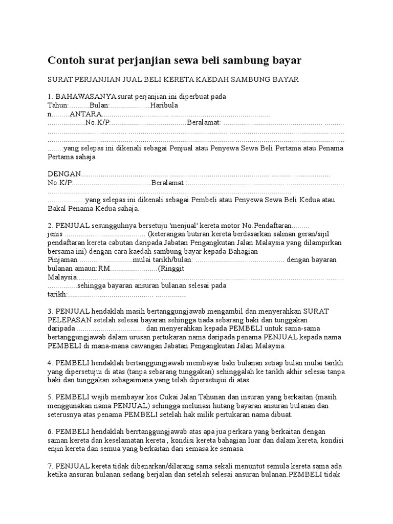 Contoh Surat Perjanjian Sewa Beli Sambung Bayar Docx Document